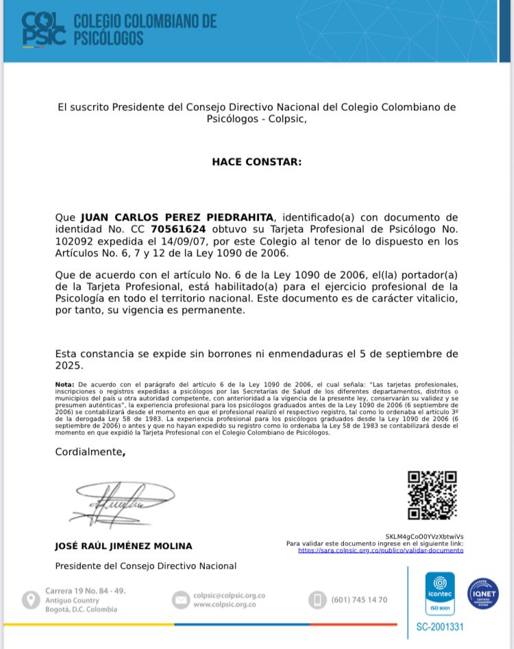 Soy un profesional que tiene como propósito de vida servir a las personas que por diferentes razones presentan dificultades para ser armónicos, plenos y vivir en bienestar. Mi pasión es colaborar en los procesos relacionados con experimentar una vida con sentido y significado. Psicólogo de la Universidad San Buenaventura de Medellín, con maestría en Psicología Holista de ESNECA - España; con más de 25 años de experiencia en lo relacionado con el desarrollo humano y procesos de intervención psicológica.